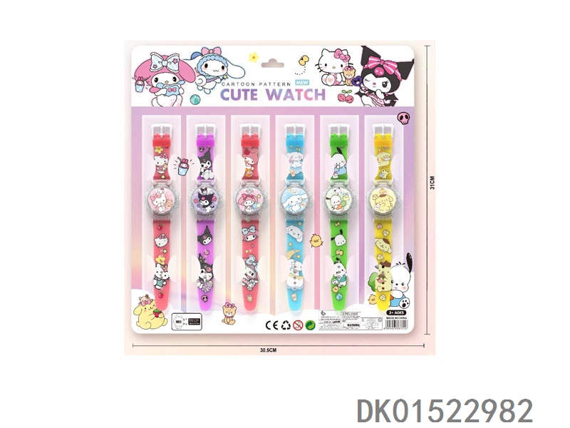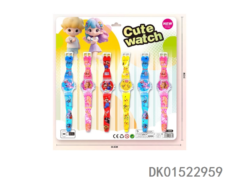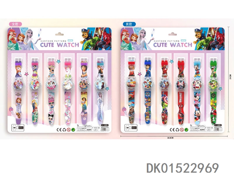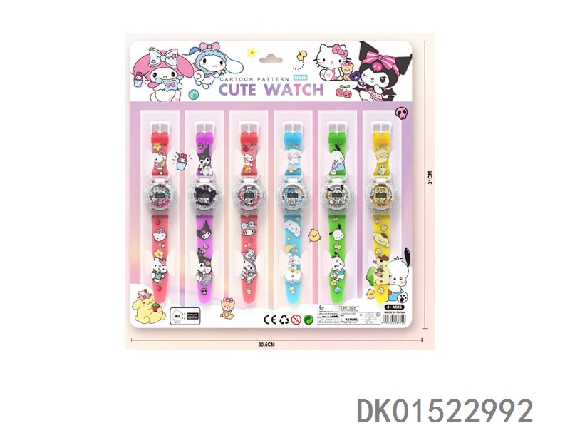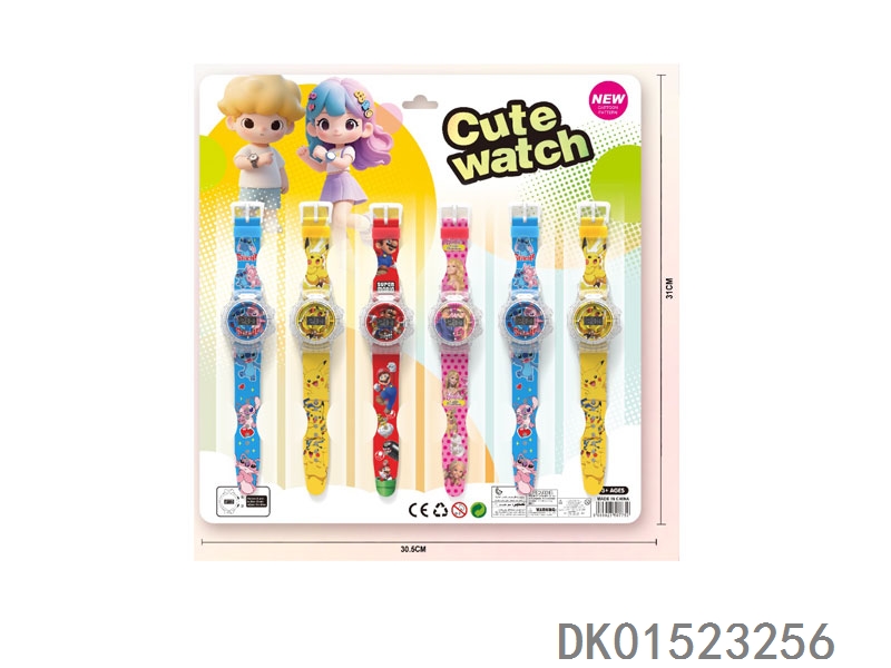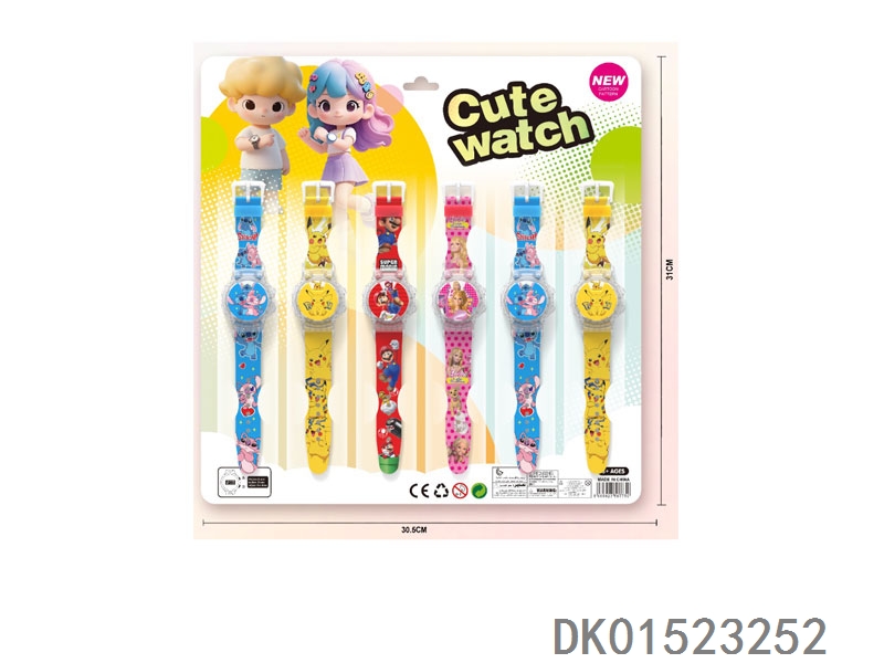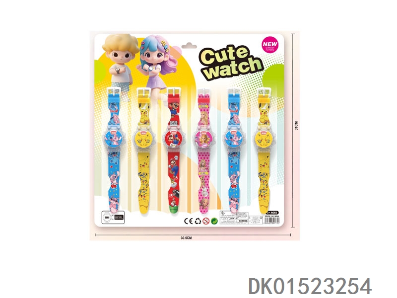 4款灯光音乐翻盖电子圆形手表配彩带图案6只/板