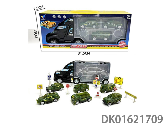惯性货柜拖头+3只合金军事车(带路标)