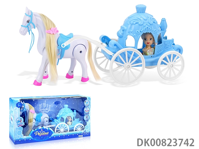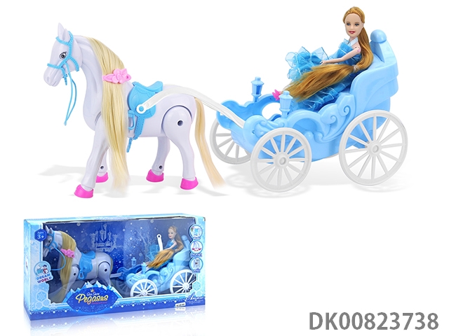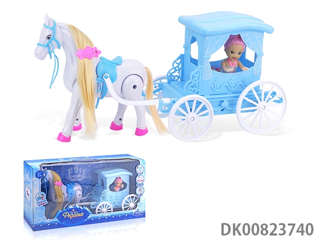 Electric flying horse and round pumpkin car and 29cm real doll, horse barking and hoof sound (4 batteries, no package)