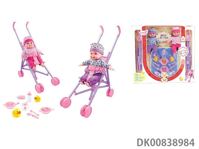 12 Inch straight-filled cotton body glue hands and feet twin dolls with 2 plastic cart cutlery