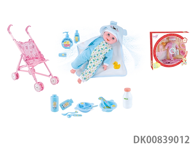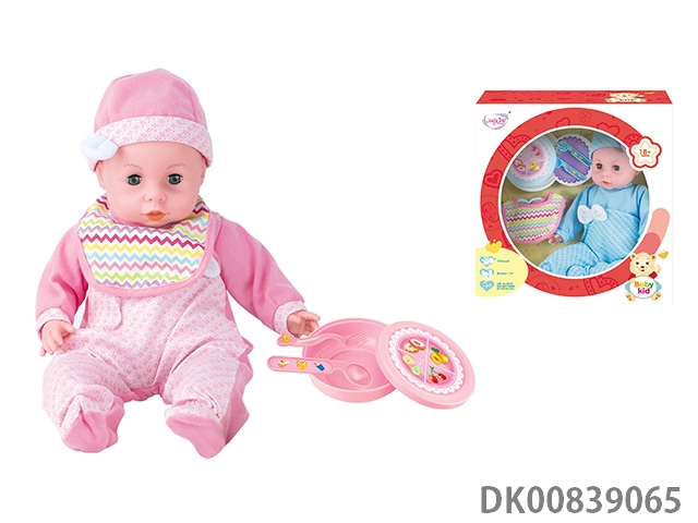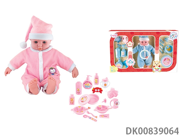 15 Inch cotton body glue hand and foot doll with bath set, tableware, with ic, 2 mixed