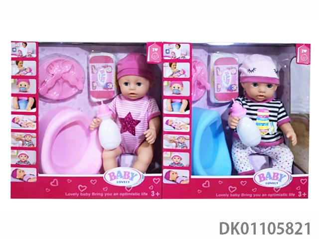 New 16 inch water and urine enamel baby with cart, toilet, dinner plate, urine pants, 6-tone ic