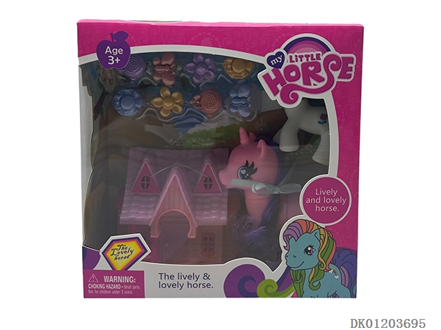 2 Enamel ponies with houses, hats, and vacuum molded accessories