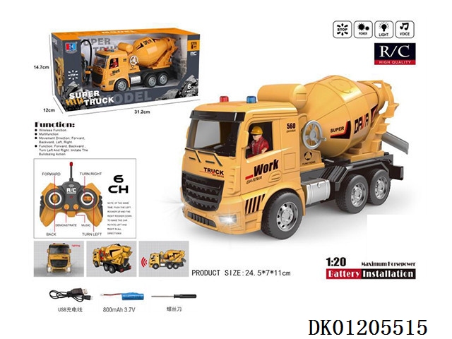 6-Channel remote-controlled mixer truck with lighting and music (mechanical arm, alarm sound, horn sound)