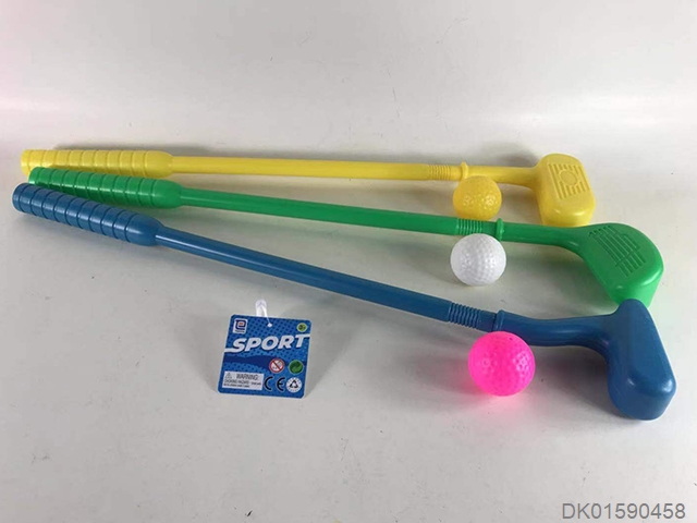 3 Golf clubs and 2 sets of flag holes, 6 balls and 3 bowling bottles, and 1 ball