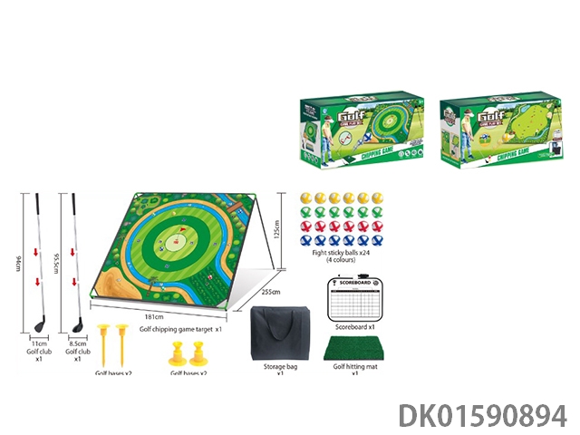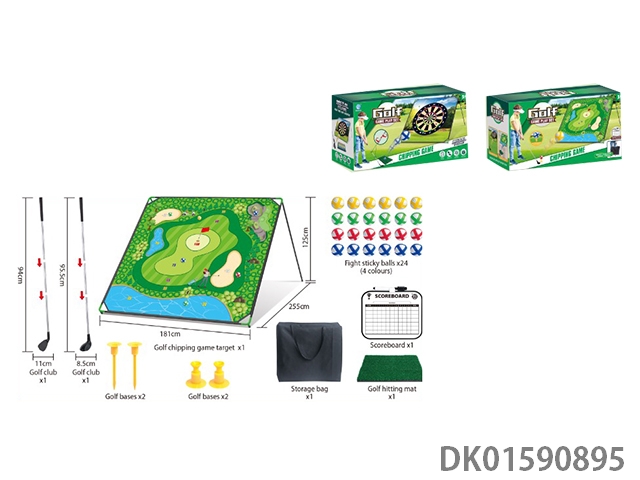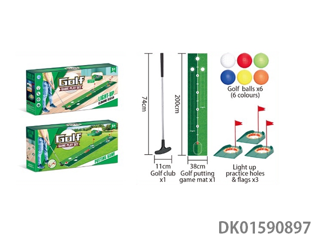 3 Golf clubs and 2 sets of holes, flag ball positions, 6 balls, and game mats 100x75cm. 12 golf balls, 4 hooks, and 1 fiber non-woven fabric 64x72cm, 3 bowling bottles, and 1 ball