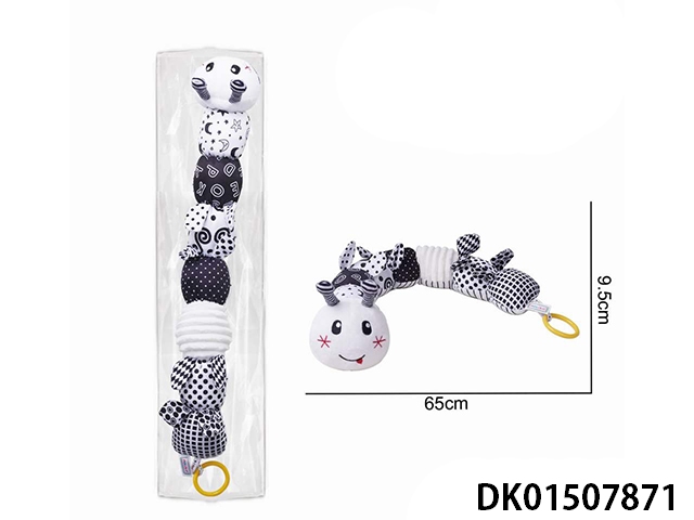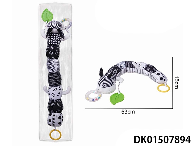 Plush black and white caterpillar, paper ringing bell, teething gum, soothing toy