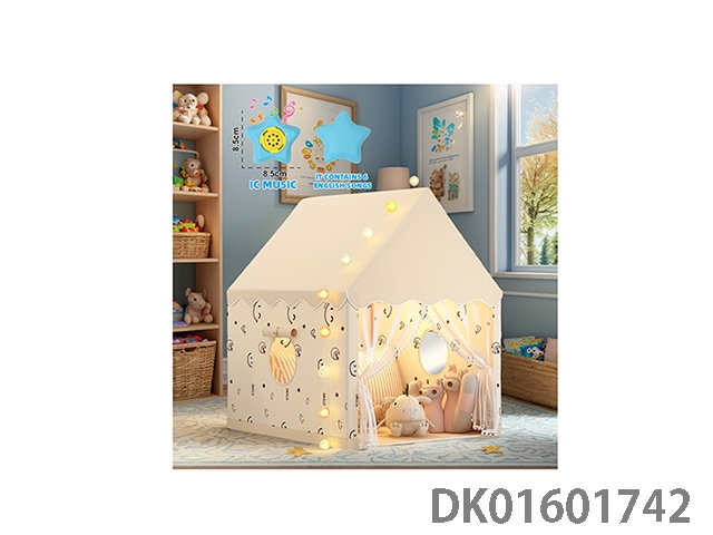 Children’s tent with a brown playful house, simple style, single door zipper design