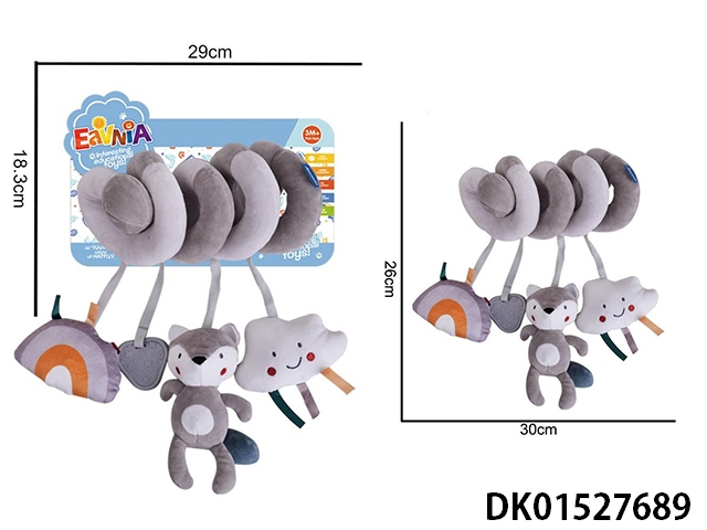 Plush gray fox cloud bed wrapped around children’s soothing toys