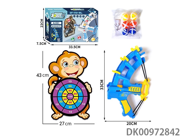 Ejection bow and arrow with monkey target sticky ball hook