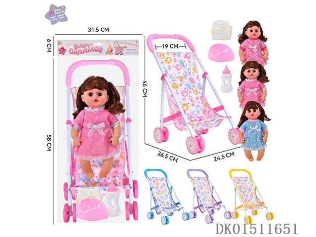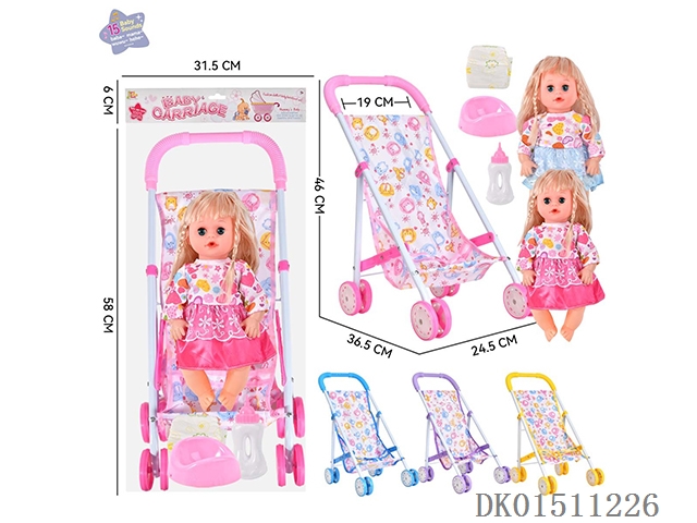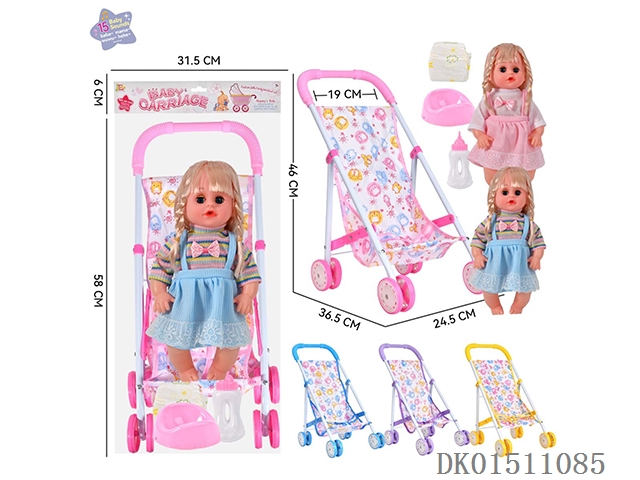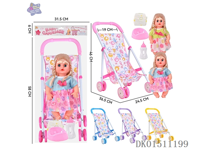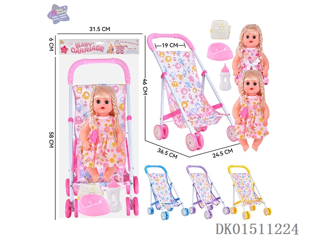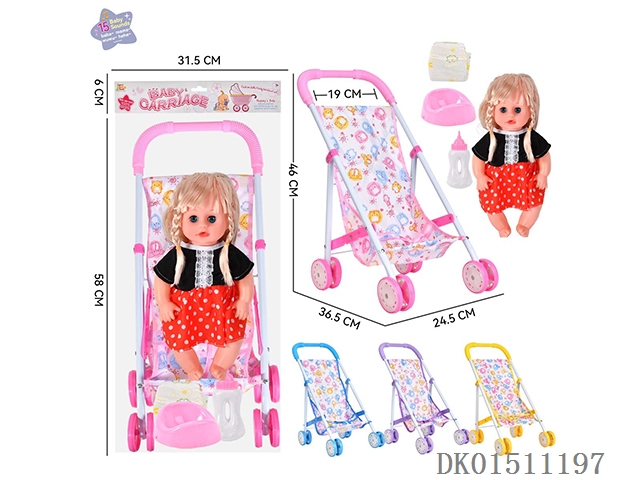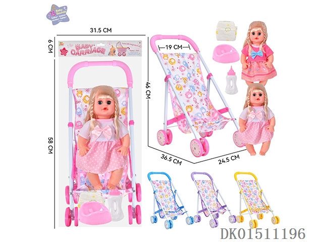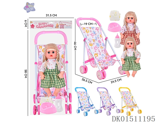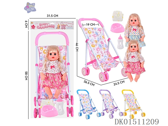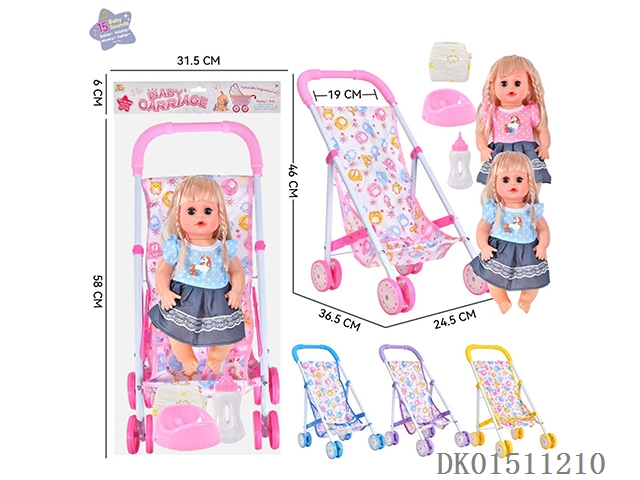14 Inch 15 tone female baby drinks water and urinates, equipped with a bottle, urinal, diaper, and iron cart (2 clothes mixed, optional 2 color mixed carts)