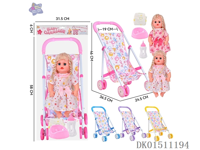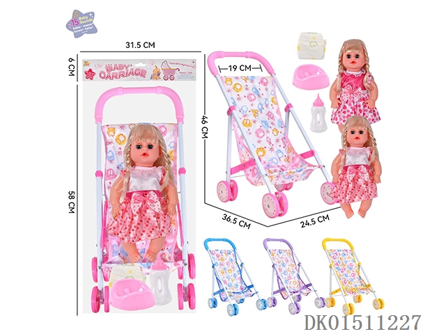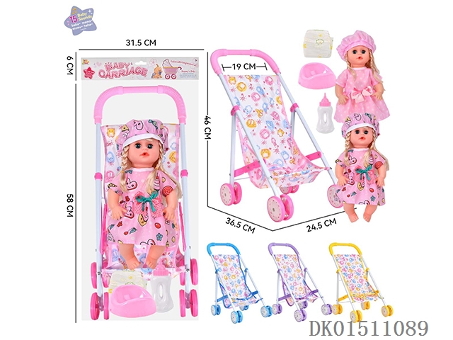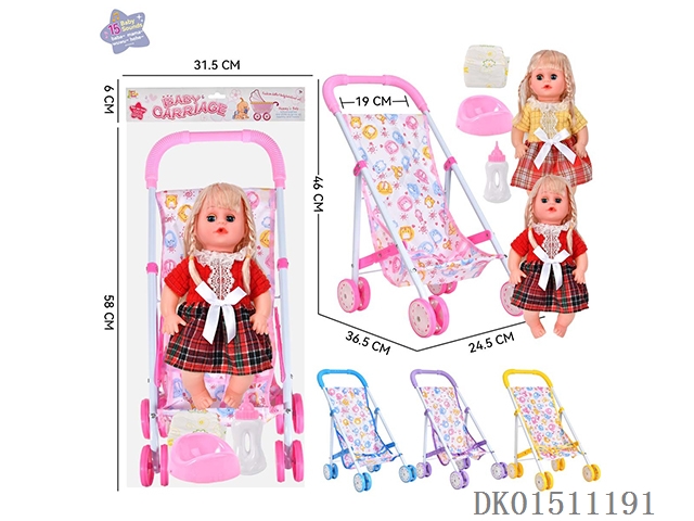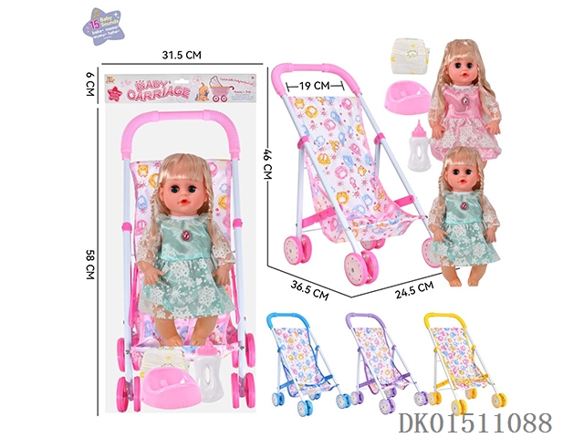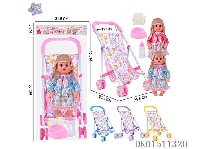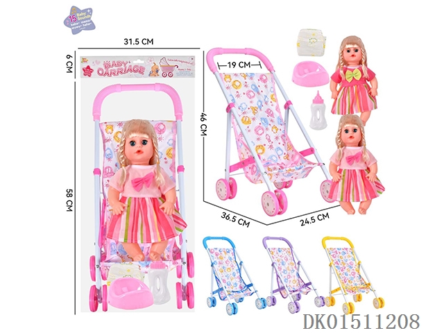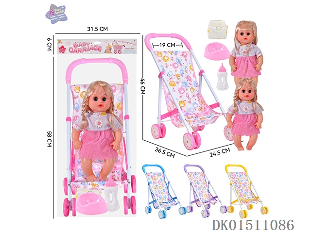 14 Inch 15 tone female baby drinks water and urinates, equipped with a bottle, urinal, diaper, and iron trolley (choose 2 color mixed trolleys)