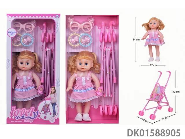 14 Inch straight legged simulation 3d eye doll with balloon stroller set (with 4-speaker ic)