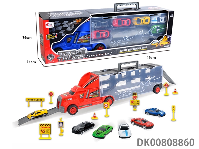 Portable gift box container trailer with 6 alloy cars, 10 road signs and 2 skateboards