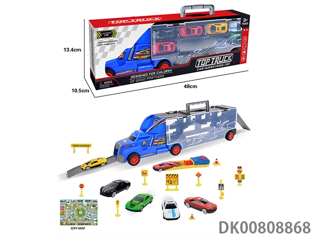 Portable gift box container trailer with 10 alloy racing cars, 10 road signs and 2 skateboards