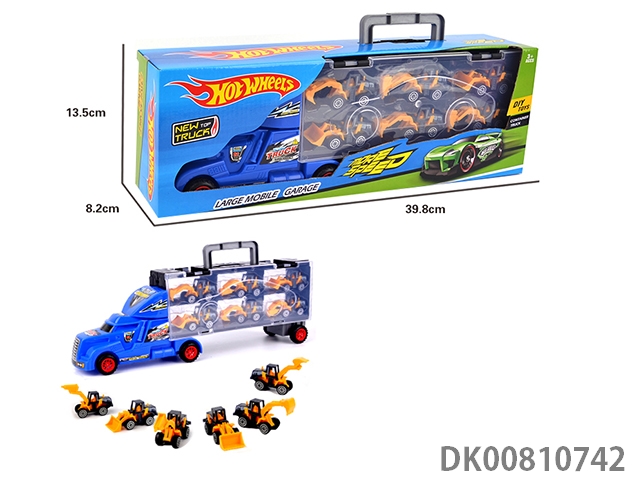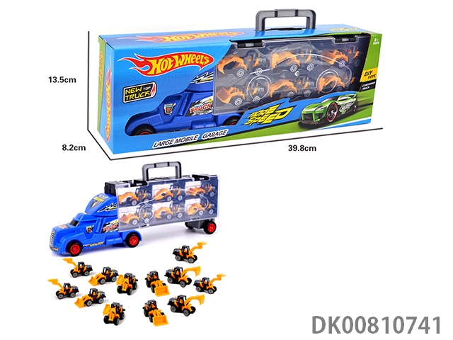 Portable gift box container tractor with 12 sliding simulation engineering vehicles (2 sides)