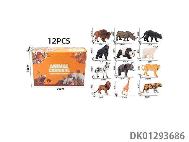 12 Animal model display boxes for wild animals, including tigers, elephants, giraffes, pandas, zebras, and a set of 12pcs per box
