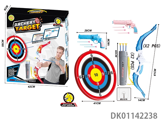 Large two bow and arrow set with large target plate and two suction cup soft bullet guns and hooks