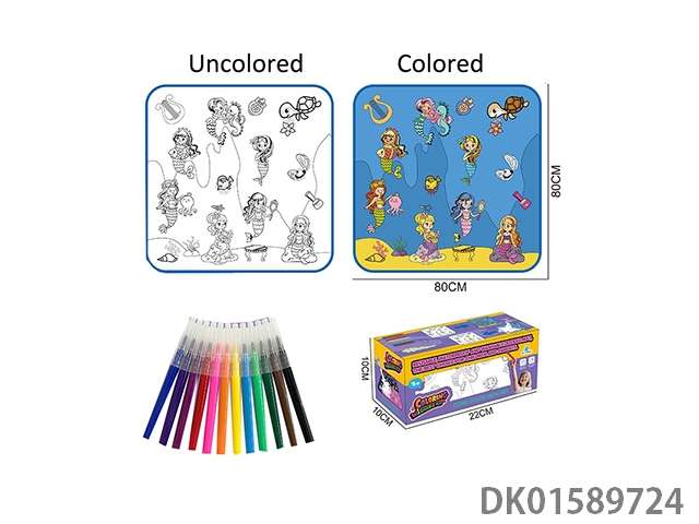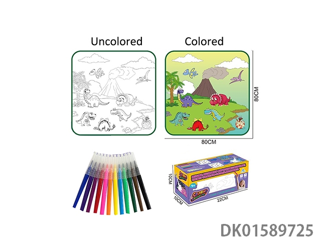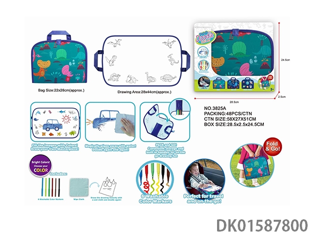 Dinosaur erasable graffiti travel bag, including 1 travel graffiti cloth (foldable into a bag), 6 color pens, and 1 wiping cloth