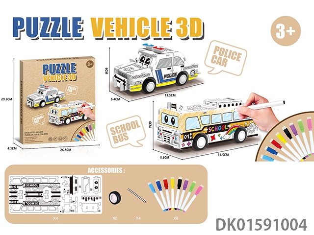3D police cars, school buses, and 8-color pens for coloring