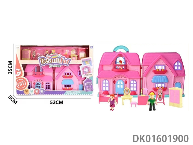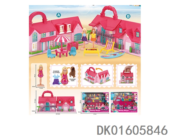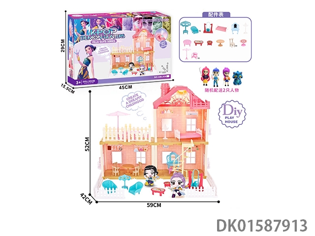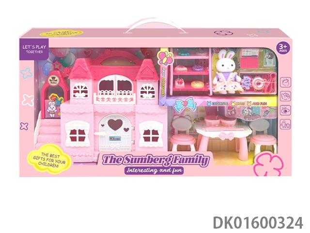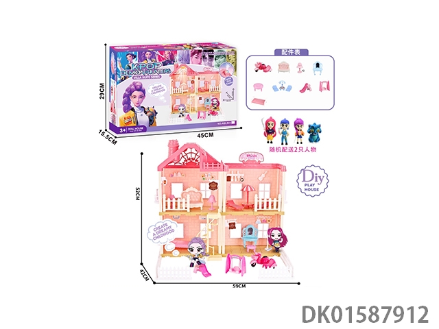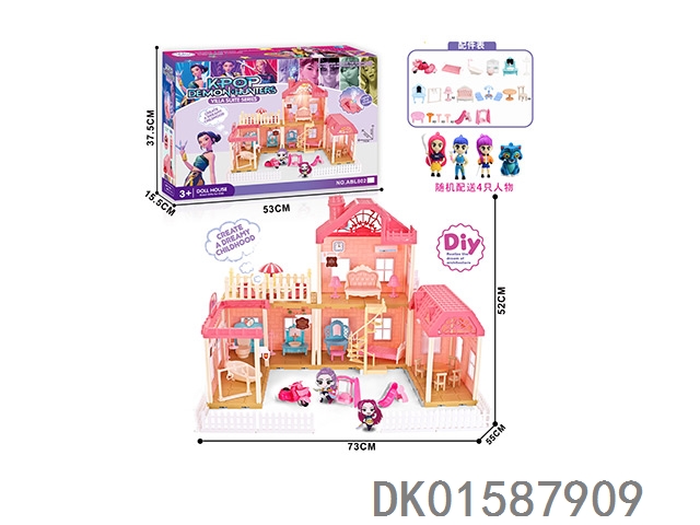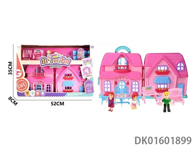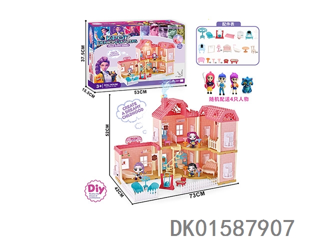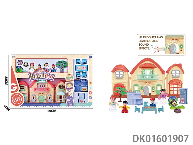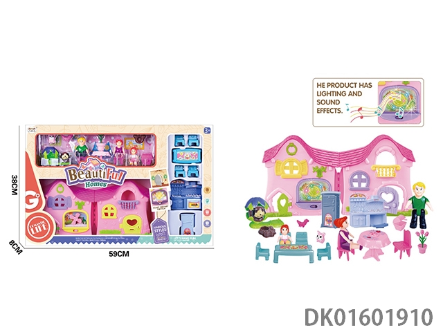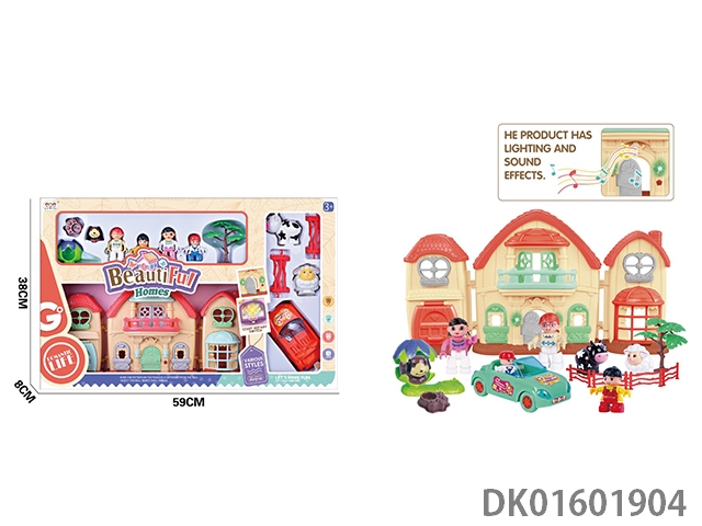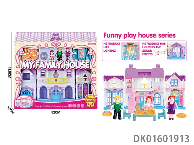 A three member doll villa set with stairs (equipped with lights, doorbell, dog sound, 2aa without electricity, colorful pendant light, and 3 ag13 bulbs)