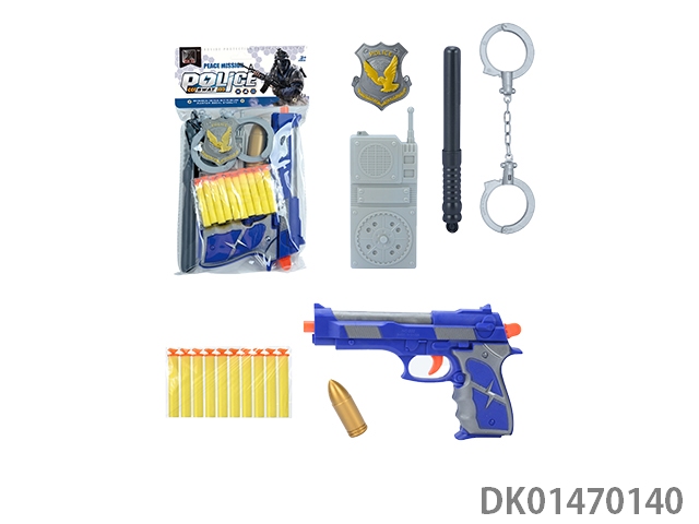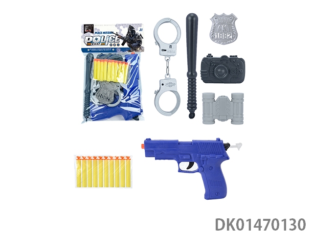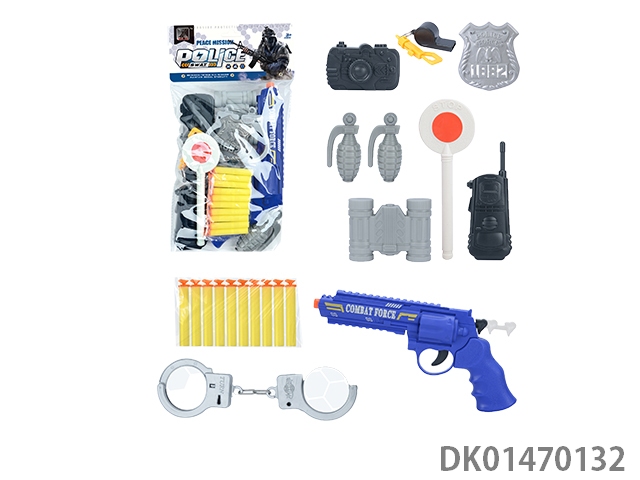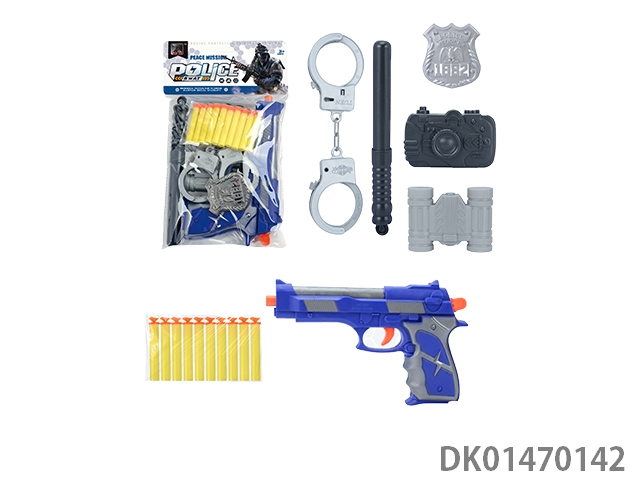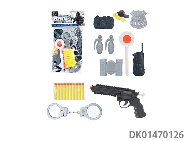 Police kit (handcuffs and hanging, badge and baton, camera and telescope, may fourth soft bullet gun and bullets * 10)
