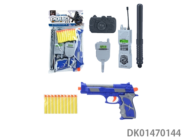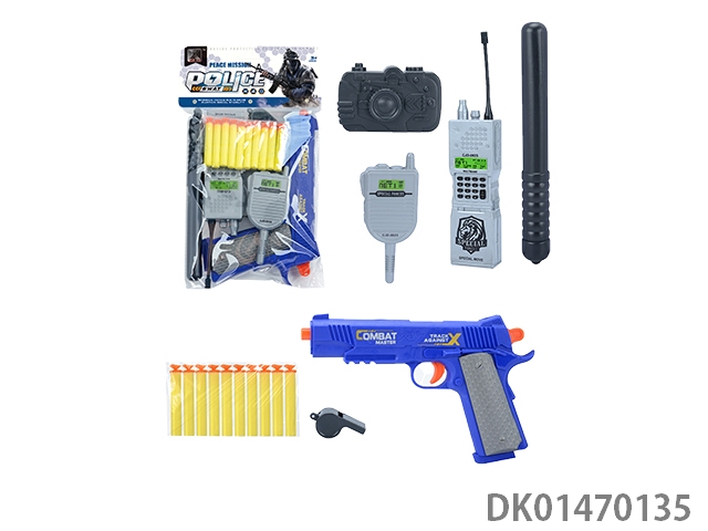 Police kit (walkie talkie and baton, camera and whistle, and may fourth soft bullet gun and bullets * 10)