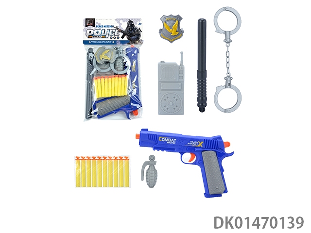 Police kit (handcuffs, badge, baton, grenade, walkie talkie, may fourth soft bullet gun and bullets * 10)