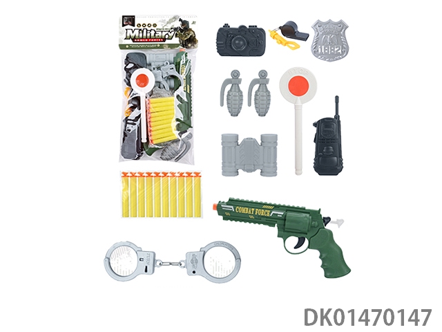 Military kit (handcuffs and badge, parking sign and grenade * 2, walkie talkie and telescope, camera and whistle with keyring and revolver soft bullet gun and bullets * 10)