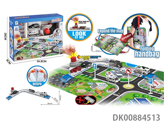 Multifunctional portable map storage bag police ejection track (alloy car) (equipped with 2 alloy cars, 1 road sign, 1 map, 1 handbag, 23pcs)