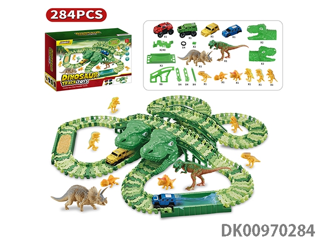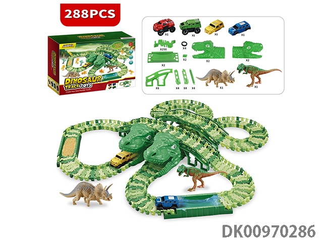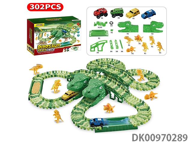 Jurassic world 3: dominate the off-road color dinosaur assembly track electric vehicle (equipped with 2 electric vehicles, replaceable car shell, 250 track pieces, 2 dragons). the electric vehicle needs 1 aaa battery and does not pack electricity