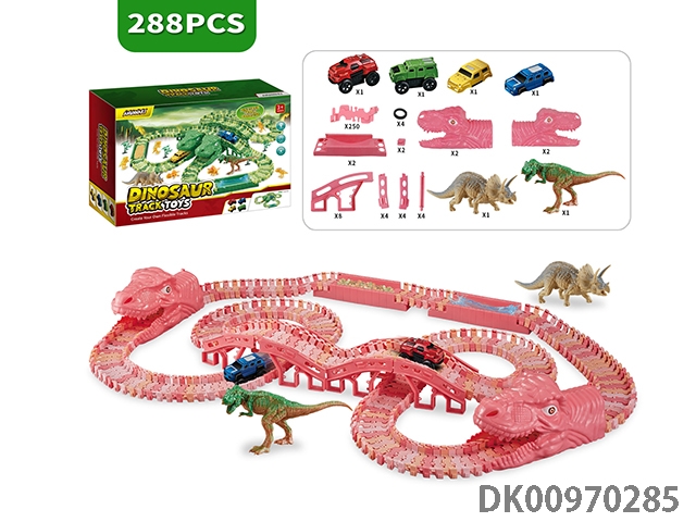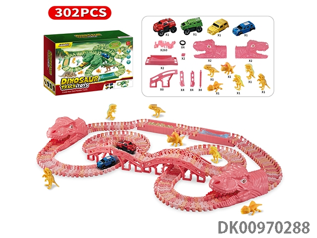 Jurassic world 3: rule - pink dinosaur assembled track electric vehicle (equipped with 2 electric vehicles, replaceable car shell, 280 track pieces) the electric vehicle needs 1 aaa battery, and does not pack electricity