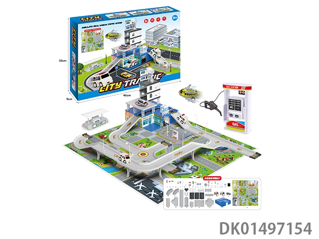 Police rail scene diy set (with gas station model and 2 regenerative cars and 1 regenerative airplane)