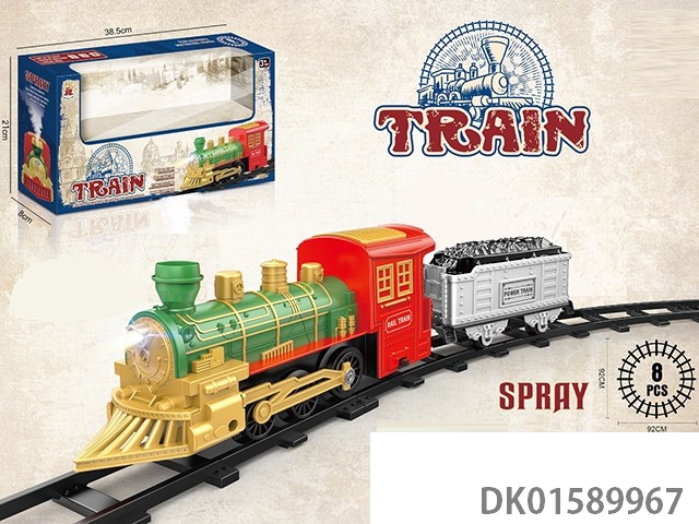 The electric rail train has spray (classical locomotive and two trailers: two alloy sports cars are provided at random), light and sound, and four No. 5 batteries without electricity