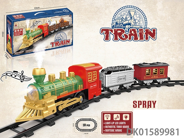 The electric rail train has spray (classical locomotive and one cargo box), light and sound, and four No. 5 batteries without electricity