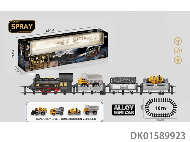 The electric rail train has spray (simulated locomotive and 2 trailers: equipped with 2 alloy sports cars, 1 cargo box and 1 passenger compartment), light, sound, and 4 No. 5 batteries without electricity