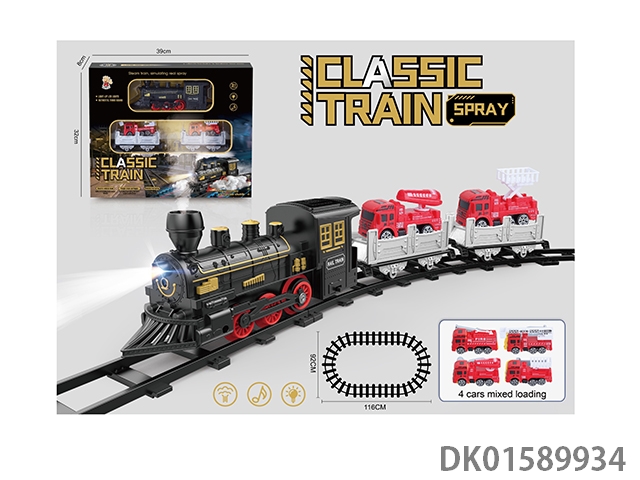 The electric rail train has spray (simulated locomotive and one cargo car, one passenger car and one carriage: one fire truck is provided with the machine), light and sound, and four No. 5 batteries without electricity