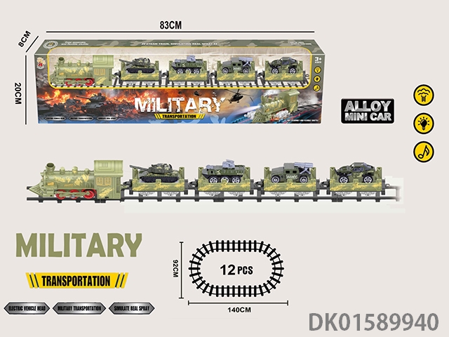 Electric military rail steam train military locomotive and 4 trailer: equipped with 4 random alloy camouflage cars with lights and sound, not including electricity, using 4 No. 5 batteries