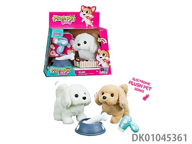 Electric plush and medium dog and bowl and bone and hair dryer